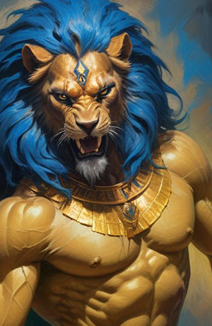 When Anhur wants to appear fearsome or powerful, he has the head and mane of a ferocious lion, and the body of a muscular human carrying a sharp falchion. He is usually wearing lamellar armor and a headdress sporting three plumes.